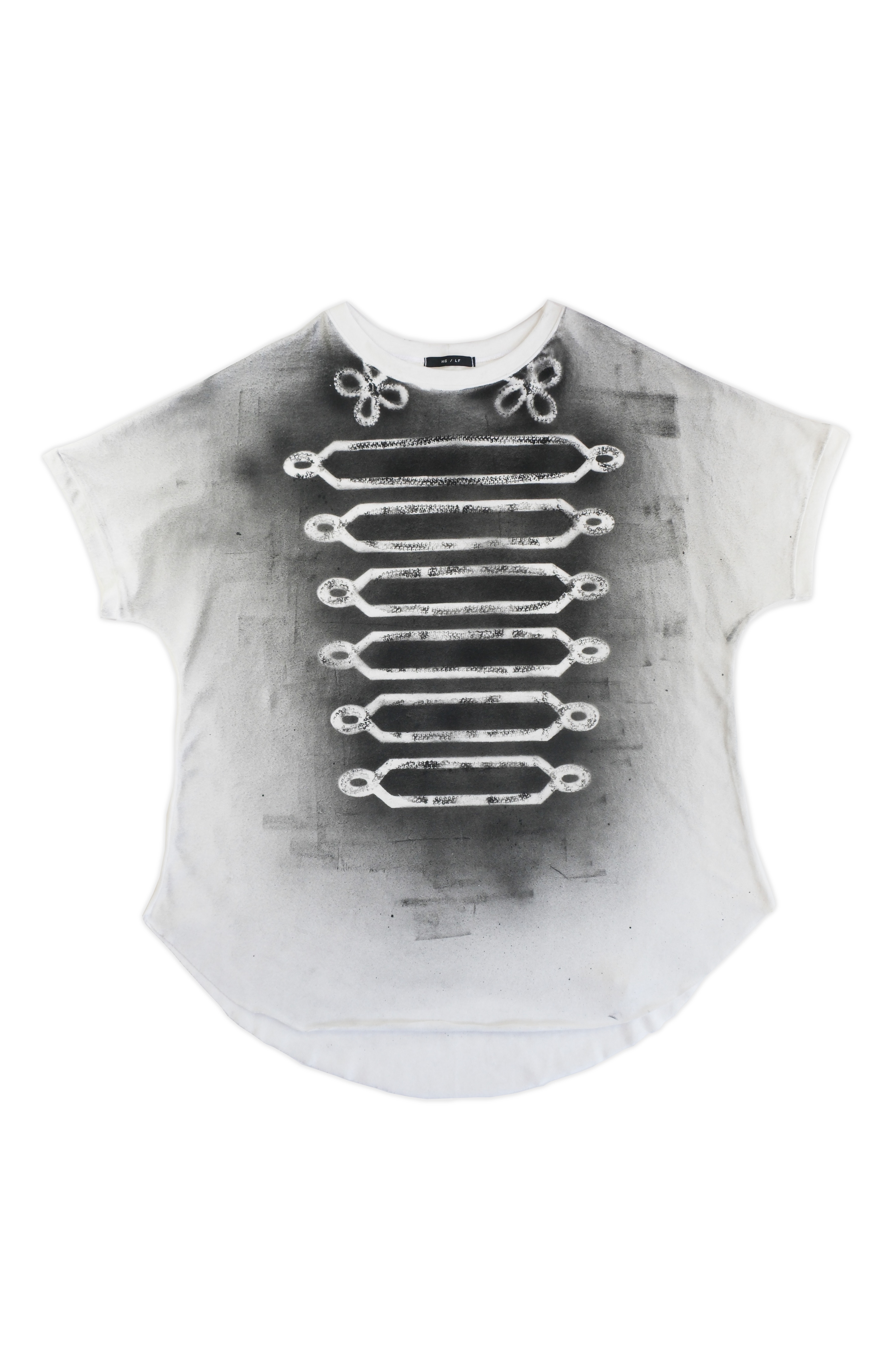 - T-shirt with the “Disarm Pattern” spray print. The design echoes and deconstructs the structure of military cords — once emblems of power and hierarchy — reimagined as a civil gesture.